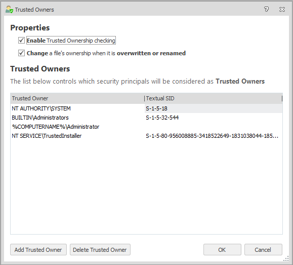 Im NTFS-System kann eine Datei einem Benutzer oder einer Gruppe gehören, daher können sowohl ein Benutzer als auch eine Gruppe hinzugefügt werden. Bei der Prüfung auf vertrauenswürdigen Besitz wird die Systemkennung (SID) des Dateibesitzers bestimmt und mit der Liste der SIDs in der Konfiguration der vertrauenswürdigen Besitzer abgeglichen. Application Control bewertet keine Gruppe und bestimmt auch nicht die Benutzer einer Gruppe. Dadurch wird sichergestellt, dass Application Control auch dann ordnungsgemäß funktioniert, wenn die Computer nicht mit dem Netzwerk verbunden und diese Informationen nicht verfügbar sind.