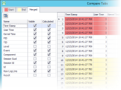 Daten aus zwei Registerkarten können zusammengeführt und in einer einzelnen Ansicht verglichen werden. Die Zeilen sind farblich hinterlegt, um zwischen den beiden Quellen unterscheiden zu können.