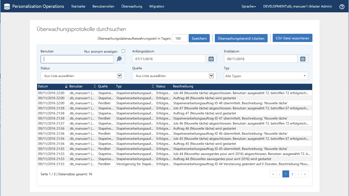 Auf der Seite „Überwachung“ können Sie Überwachungsaufzeichnungen für Personalisierungsvorgänge-Ereignisse anzeigen. Wenn Sie die Seite zum ersten Mal öffnen, sind alle Überwachungsprotokolle sichtbar, für die Sie über Anzeigeberechtigungen verfügen. Die Protokolle stehen in einer Tabelle mit den folgenden Spalten: