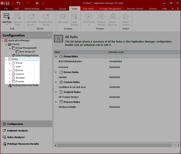 To display all rules in the configuration, click Rules in the navigation tree. A summary displays all rules listed under the relevant rule type. The security level assigned to each rule is seen and can also be amended.