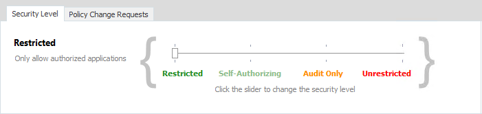 Apply security levels to control whether the user, group, and devices specified in a rule are fully restricted by Application Control rules, unrestricted, audited only, or granted self-authorization status entitling the user to decide whether to run an application. Self-authorized users can be audited by raising events in the Auditing component and the Windows Event Log.