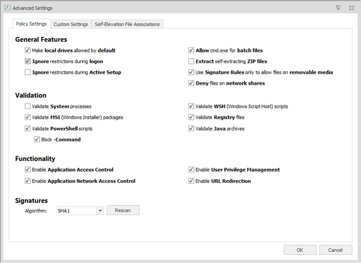 | Validate PowerShell scripts | When enabled, this setting denies powershell.exe and powershell_ise.exe. However, if a PowerShell script (PS1 file) is found on the command line, then, it is subjected to a full rules check to see if it is configured for elevation, allowed, or denied. |