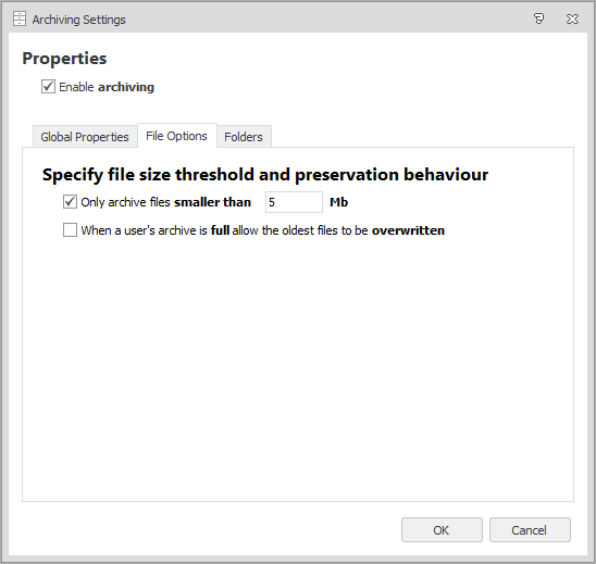 Use the Global Properties tab in the Archiving Settings dialog to control what is archived and to define the maximum or minimum size of the archives, by selecting one or more of the following:
