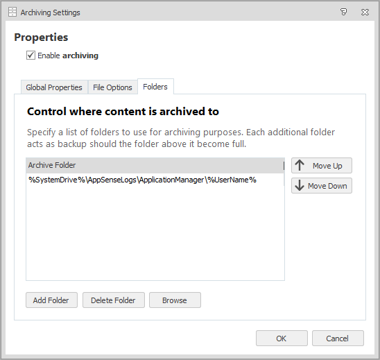 - Add Folder - Add an archive location to the list. The archive may contain environment variables. For example, %SYSTEMDRIVE%\Archive\%USERNAME% is expanded when Application Control attempts to archive the file. Each user has a personal archive.