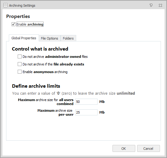 - Maximum archive size for all users combined - The maximum size in MB that combined users are allowed to reach before files are overwritten. A limit setting of zero (0) is interpreted as no limit.