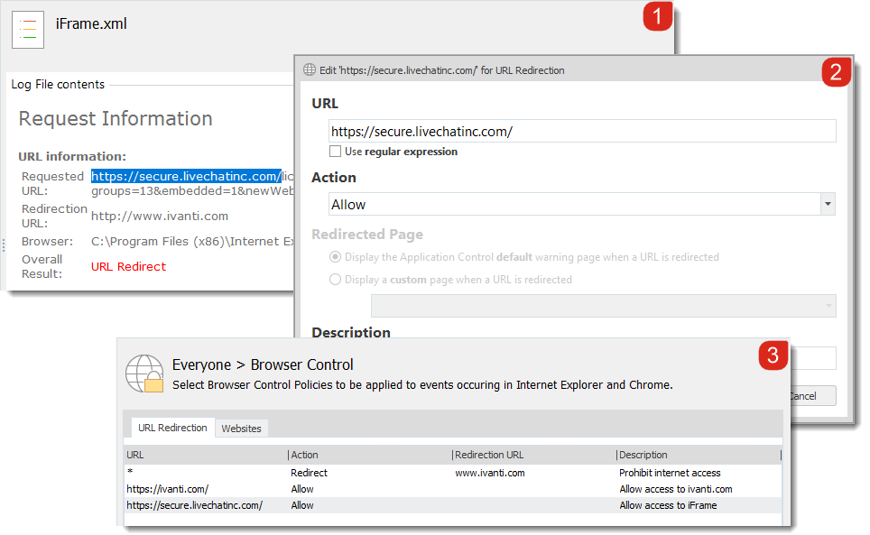 If you are using an allowlist approach and allow access to a site that uses Inline Frames (iFrames), you must set up URL redirection items to allow the URLs for each inline frame. If the URL for an inline frame is redirected, the main website URL is also redirected, even though it has been configured to be allowed.