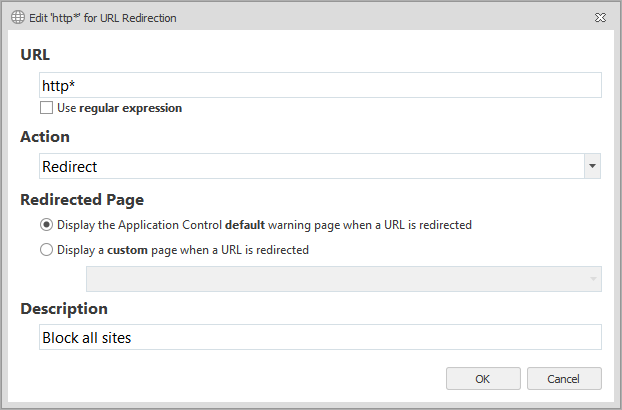 Use this feature to automatically redirect users when they attempt to access a specified URL. By defining a list of prohibited URLs, you redirect any user attempting to access a listed URL to a default warning page or a custom web page. You can also select to allow certain URLs which, when used in conjunction with redirects, gives you further flexibility and control and lets you create a allowlist of websites.