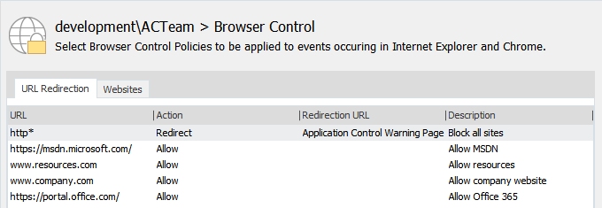 - In the Application Control console, create a configuration with URL redirects to: