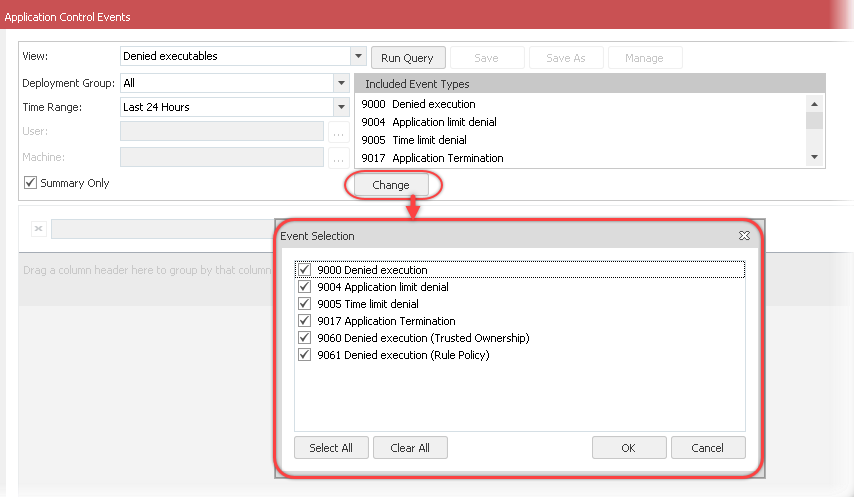Most views return only single event types. For example, Privilege Management lists when application privileges are changed (event ID 9018). Other views return a number of event types. For example, Denied Executables displays events recording denied execution, application limit denial, time limit denial, application termination, denied execution (using trusted ownership), and denied execution (using rule policy).