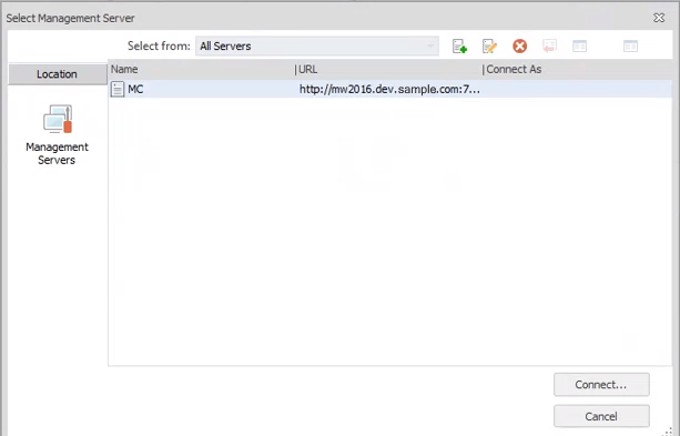 From the Select Management Server dialog, select the connection required, then select Connect to open the user connection dialog.