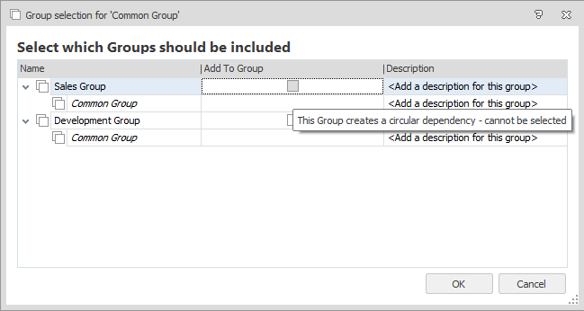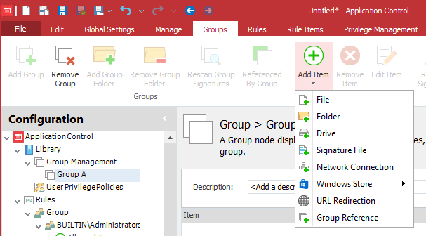 You can add groups to the Allowed Items, Denied Items, and User Privileges rule items, eliminating the need to add items individually to the lists. When adding a group to a rule item, Application Control implicitly includes all referenced groups.