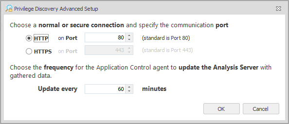 Advanced settings are optional and allow you to configure Privilege Discovery further by providing the facility to specify the types of connection and the specific communication ports. You can also choose how often the Application Control Agent updates the Analysis Server with the gathered data by entering the time in minutes.