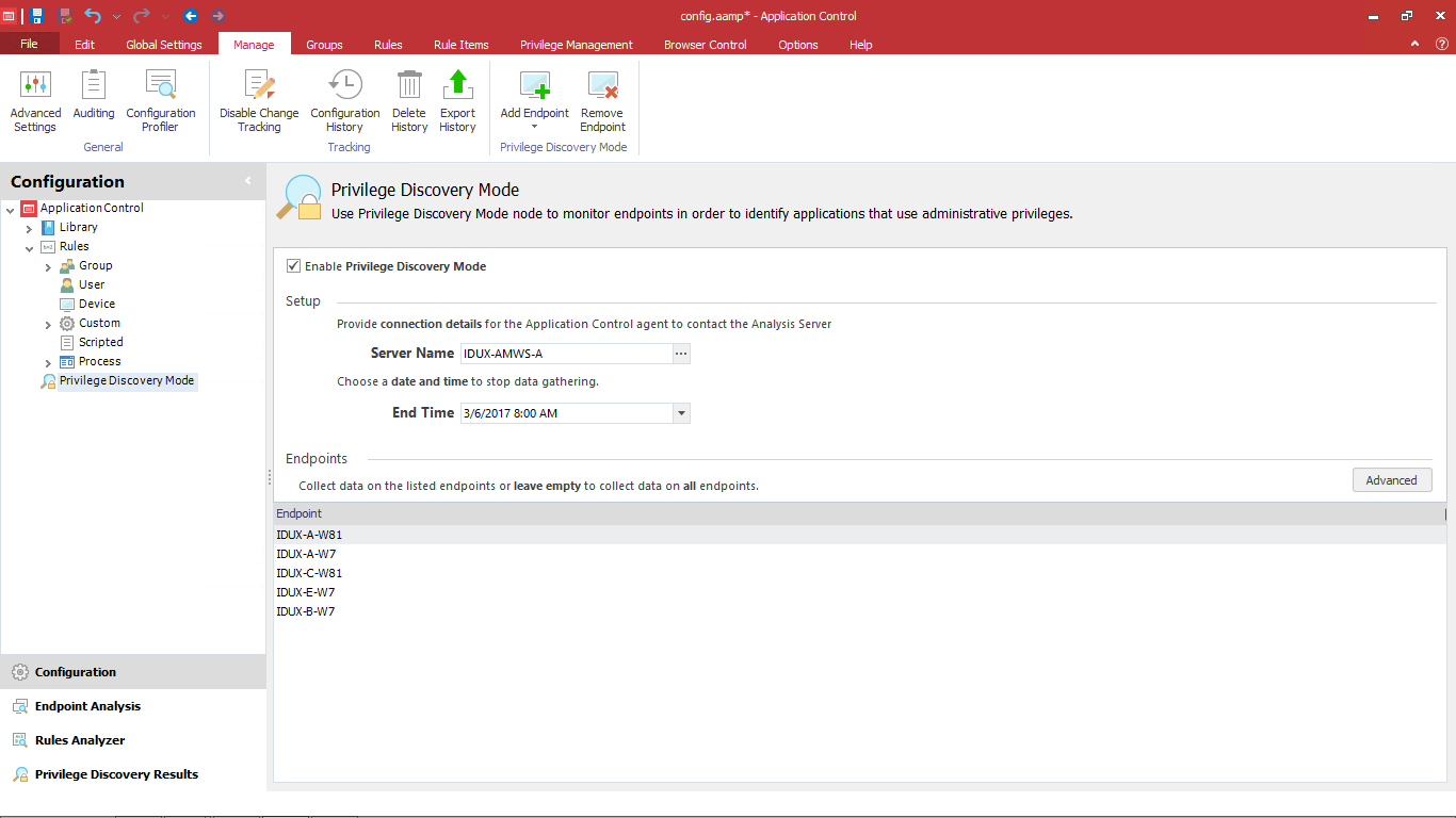 The Privilege Discovery Mode is accessed from the Configuration navigation button, Privilege Discovery Mode node and provides the functionality to monitor endpoints in order to identify applications that use administrative privileges. A web service is used to collect the data and relay that data to the Privilege Discovery Results work area in the Application Control Console. The data listed in the reports can be used to simplify the creation of an appropriate Application Control configuration and to produce reports.