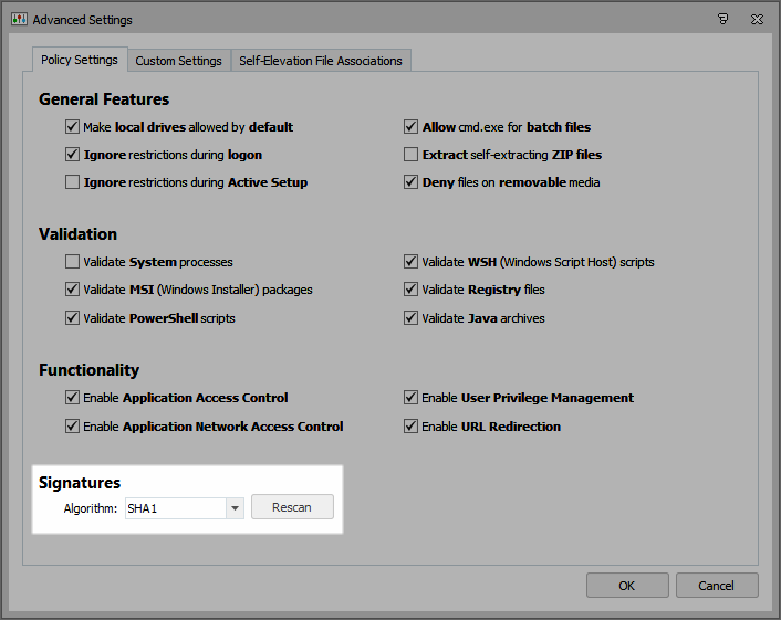 - To rescan all the updated files in a configuration, under Signatures, select the required algorithm and click Rescan.