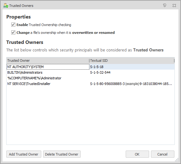 During the rule matching process, Trusted Ownership checking is performed on files and folders to ensure that ownership of the items is matched with the list of trusted owners specified in the default rule configuration.