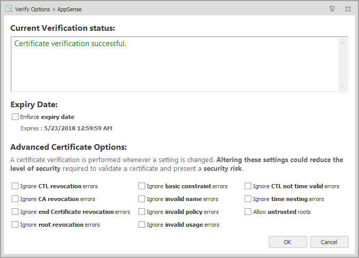 Verify Options - Check the status of the certificate, enforce the certificate's expiry date and apply advanced certificate options.