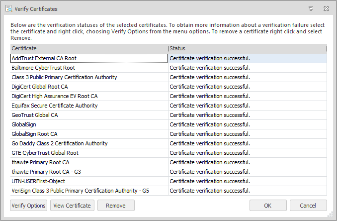 The Verify Certificates dialog lists the name(s) of all added certificates. The Status column shows whether the certificate has been validated successfully or if any errors have been detected.