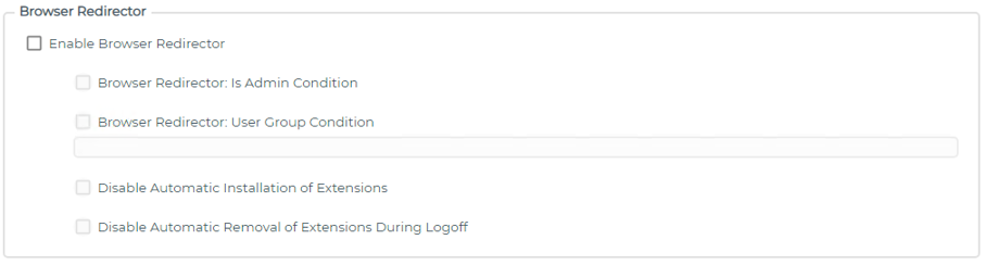 By default, the Browser Manager Agent will install the Browser Redirector browser extensions when the Browser Redirector feature is enabled for a user. Selecting this option disables the automatic installation of the Browser Redirector browser extensions.