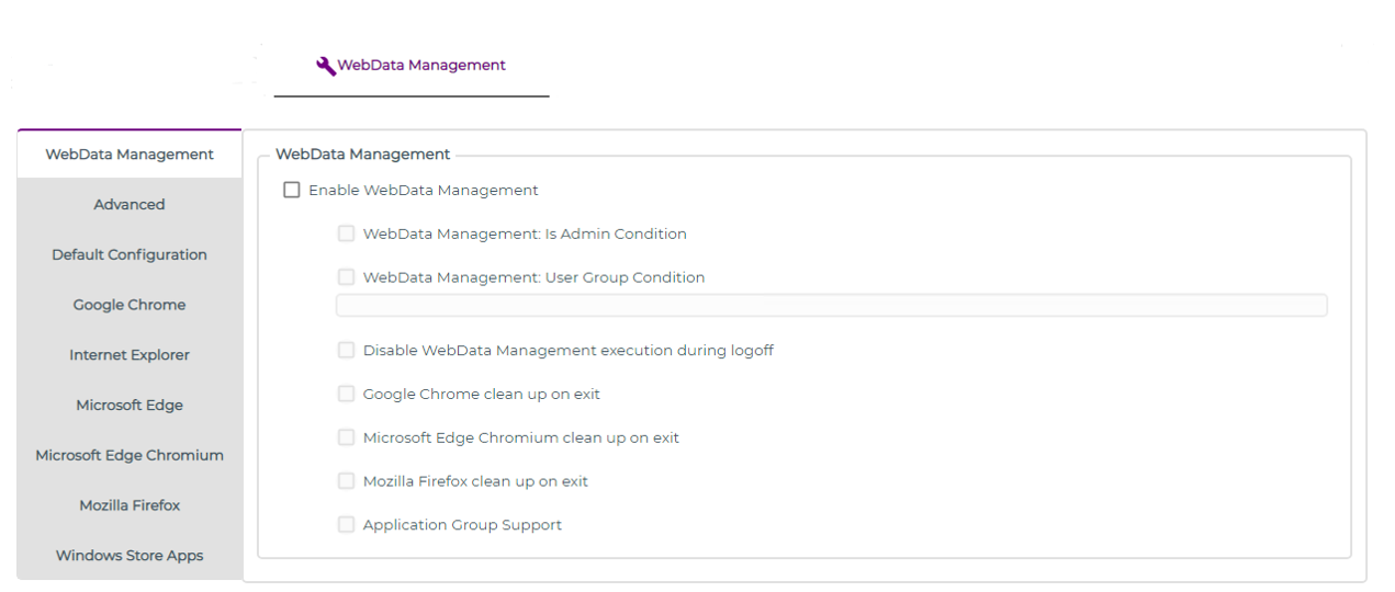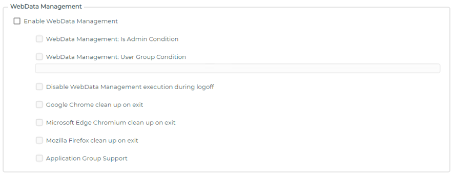 By default, WebData Management executes at user log off, for all browsers. These options allow Firefox, Chrome, and Edge Chromium to perform data removal as device users exit these browsers.
