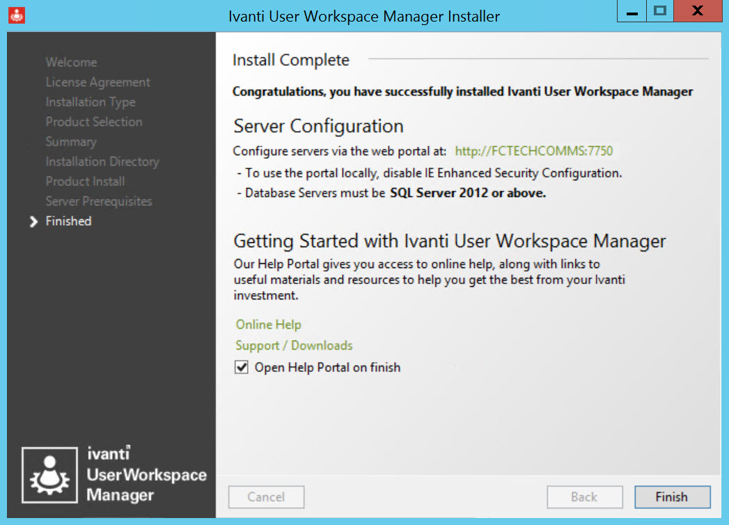 If you want to exit without opening the Product Documentation, deselect Open Help Portal on finish and click Finish.
