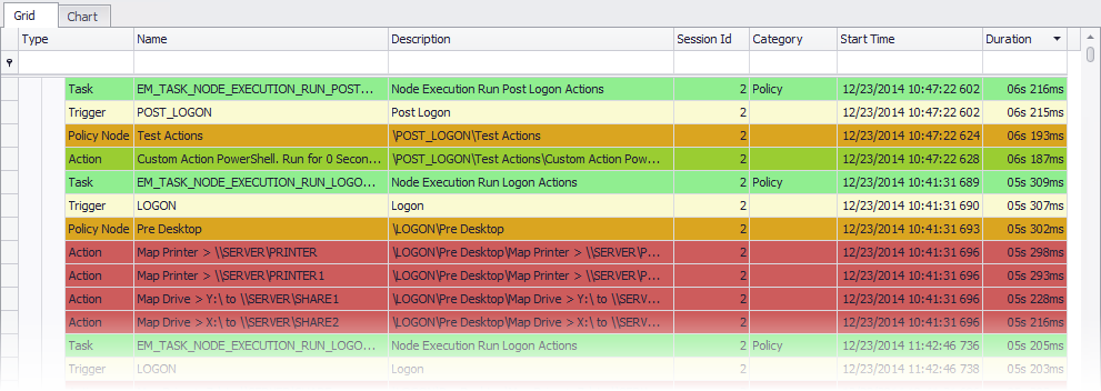 In the following example, the Logon trigger took 5s 307ms to complete due to four failing Map Drive and Map Printer actions:
