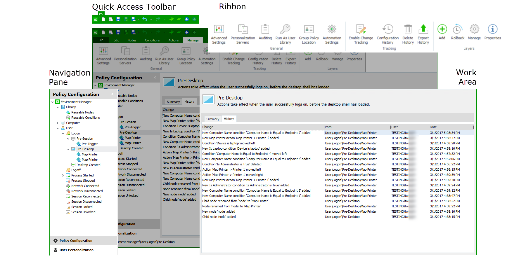 The traditional Environment Manager installation, using Setup.exe, automatically installs the combined console. Some administrators may not require access to both. For example, they may only be responsible for configuring personalization and have no need for the policy side of the console. Installing the Personalization or Policy consoles can only be done using the Environment Manager Console MSIs.