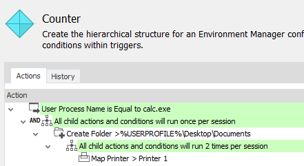 The Counter condition allows the child actions and conditions to be run a specified number of times within a single session. For example, an action could be set to run only for the first three times an application is used in a session. If the application is run again, the action will not run.