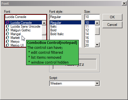 | Parent Text | The text associated with the parent window of the Windows control and appears in the header text of a dialog box. If you are locking down the OK button in a Font dialog box, the parent text will be Font. |