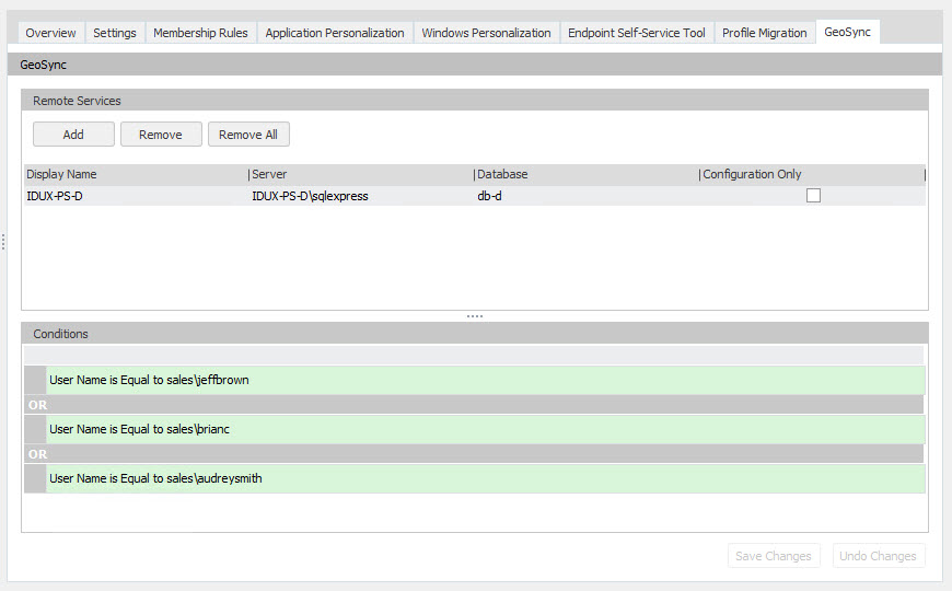 GeoSync provides a method of synchronizing user data and Environment Manager Personalization configurations between personalization server SQL server databases. This lets users access their data and settings at multiple locations, providing them with a consistent experience wherever they log on. Any changes they make are synchronized back to the published on the next sync.