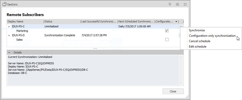 Caution Setting up GeoSync on an existing subscriber that contains a configuration or data that is not on the publisher will result in data loss and is not supported in this release. If you wish to use local-only Personalization Groups on your remote subscriber(s) these should only be set up after GeoSync has been configured.
