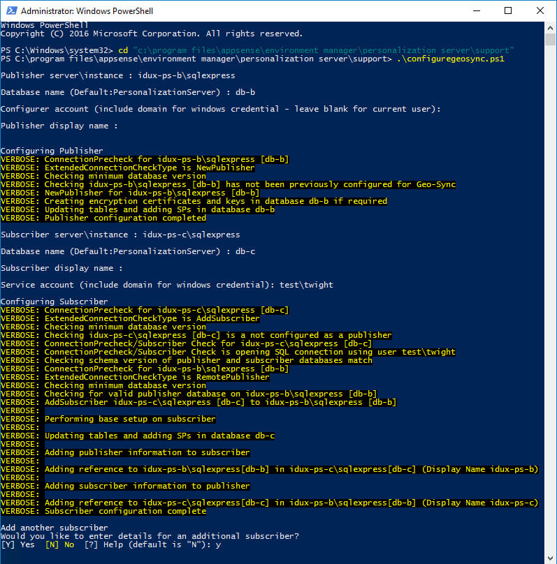 Set up GeoSync for your publisher and associate your subscribers using the ConfigureGeoSync.ps1 script. Set up can also be performed using the cmdlets supplied during Environment Manager installation. Some actions, such as adding new subscribers to existing publishers, can only be done using the cmdlets.