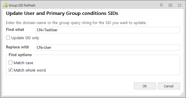 The Group SID Refresh option allows you to replace group and user domain names in a configuration and refresh Security Identifier (SID) values in membership conditions.