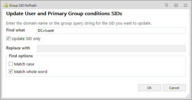 - If not selected the Replace with field is enabled. In addition to the SIDs being refreshed, domain names are changed to the value specified. Find options can be set for matching case and whole words.