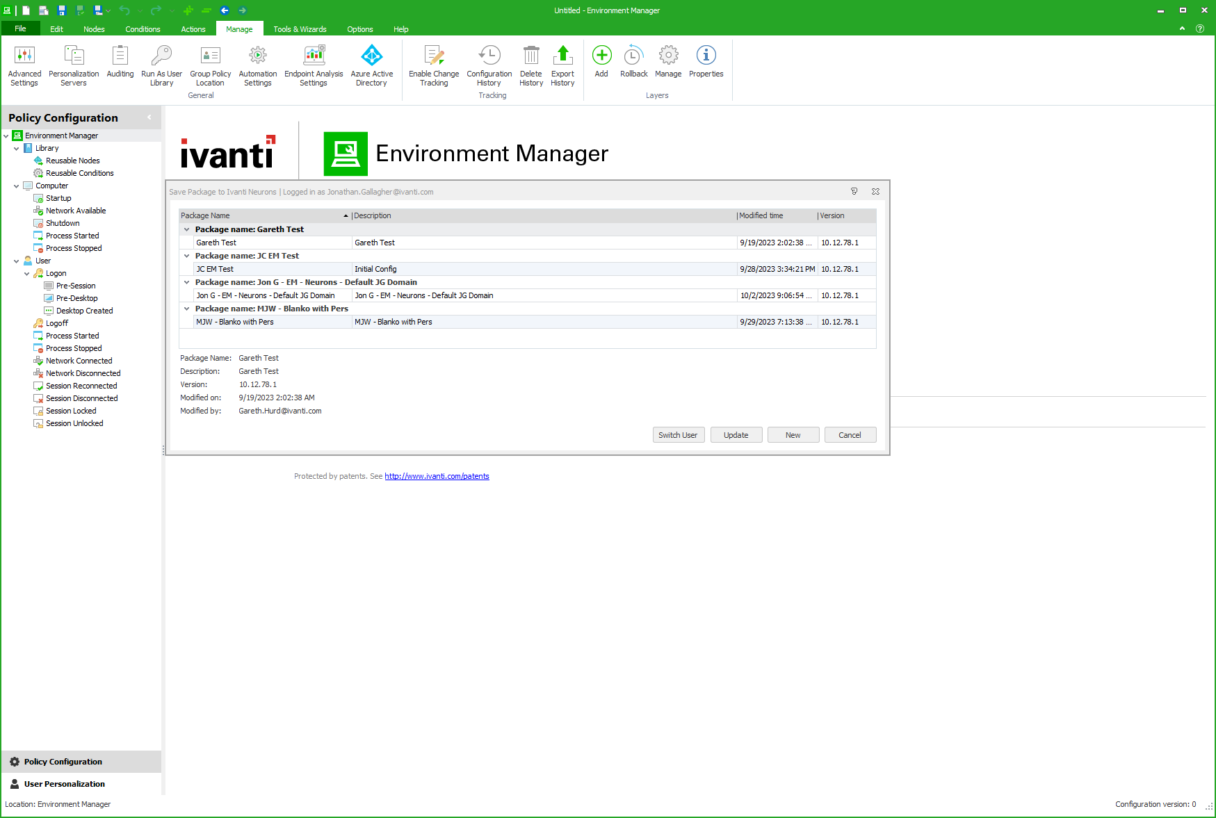 Environment Manager integrates with Ivanti Neurons to save and deploy configurations. Environment Manager can use Ivanti Neurons to save and deploy configurations to target devices through agent policies. Use Environment Manager to create, update, and save configurations.