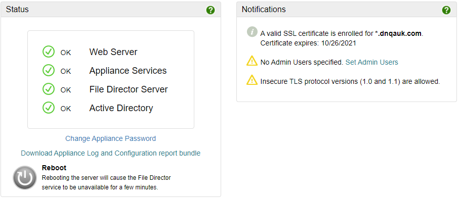 - Change Appliance Password- Click the link to open the Change Appliance Password dialog (File Director 2021.1).