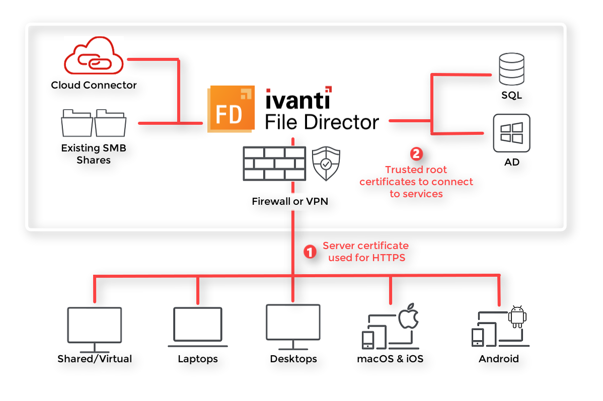 - Server certificate – this is presented to File Director clients and is used to encrypt the HTTPS connection for the Web Client and Web Admin. The server certificate must be configured for most File Director deployments.