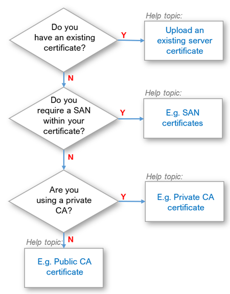 The exact process to configure a server certificate will vary, depending upon whether you are importing an existing certificate, and whether you are using a public CA or an internal one.