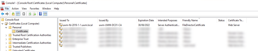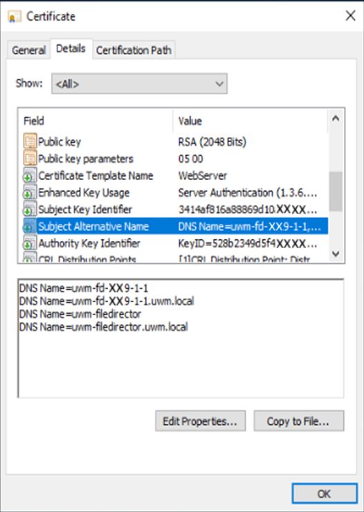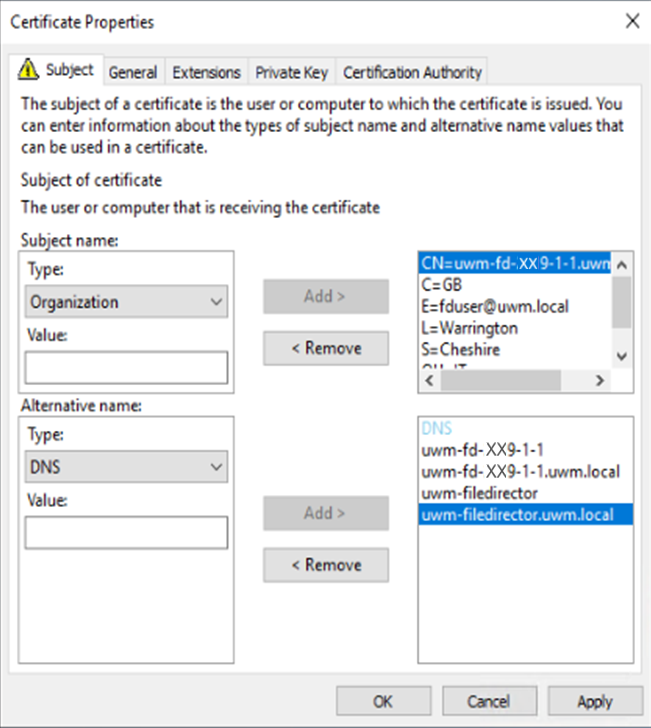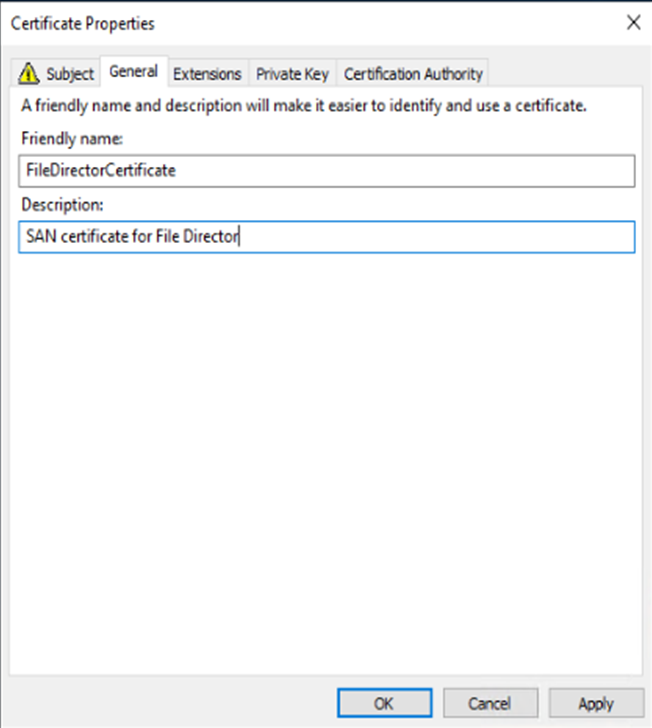 This section describes how to configure a File Director certificate that contains SAN extensions. In this example, a SAN certificate is generated using a private CA, exported as a PFX file and then uploaded to File Director.