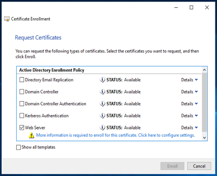 The Certificate Enrollment wizard displays. - Click Next and Next again.