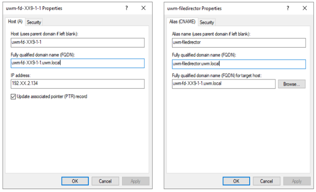 The A record is typically created when installing the File Director appliance and maps the IP address to the specified host name. A CNAME records allows you to map one domain name (an alias) to another (the A record for example).