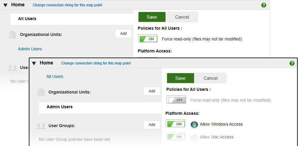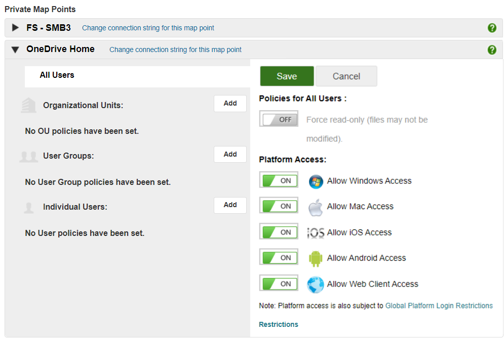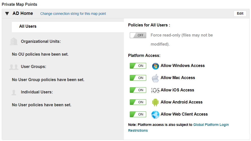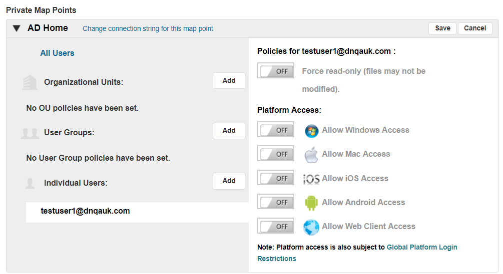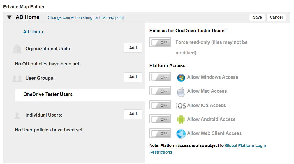 Click the Platform Access buttons to switch them Off. This action excludes the selected user(s) from this policy and use of this map point storage location.