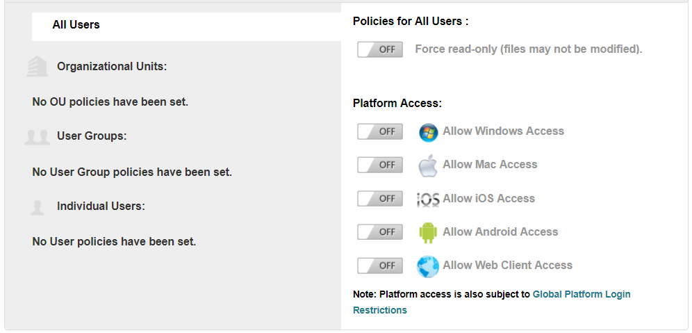Platform access can also be set globally which may result in policy setting conflicts. Refer to the table below for examples.