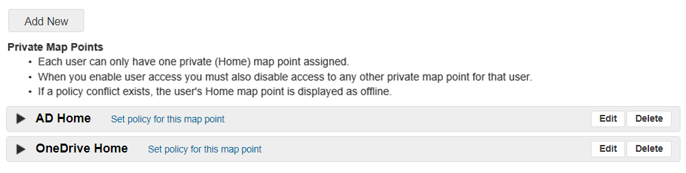 In our example, the existing map point is named AD Home. Click the link Set policy for this map point and then click Edit. Alternatively, click Policy > Map Point Access, then click Edit next to the AD Home map point.