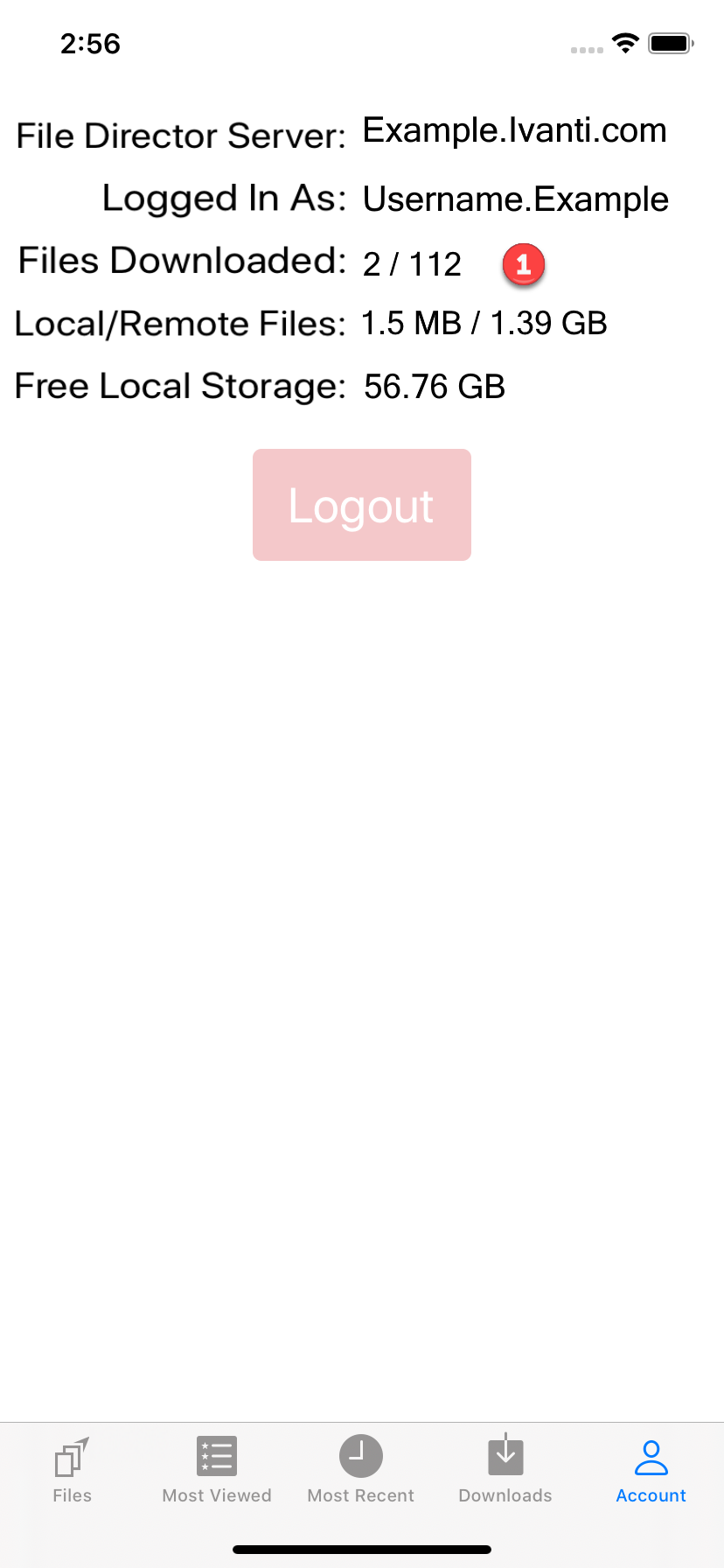 The view shows the current account information; File Director server address, the current user ID, and a summary of files downloaded and file storage details.