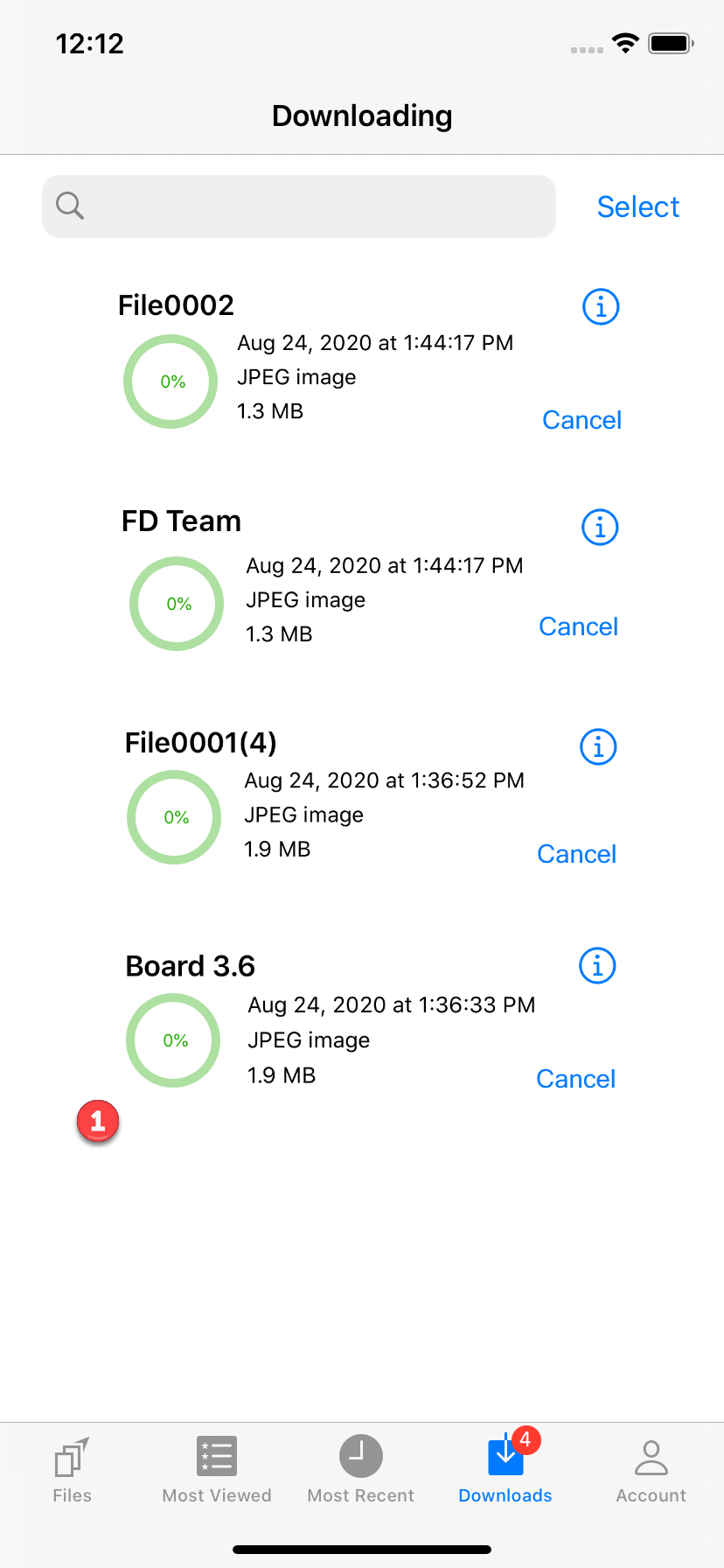 The dynamic content shows the number of files currently in the process of being downloaded. To cancel a download that is in progress, tap the file icon, then tap Cancel.