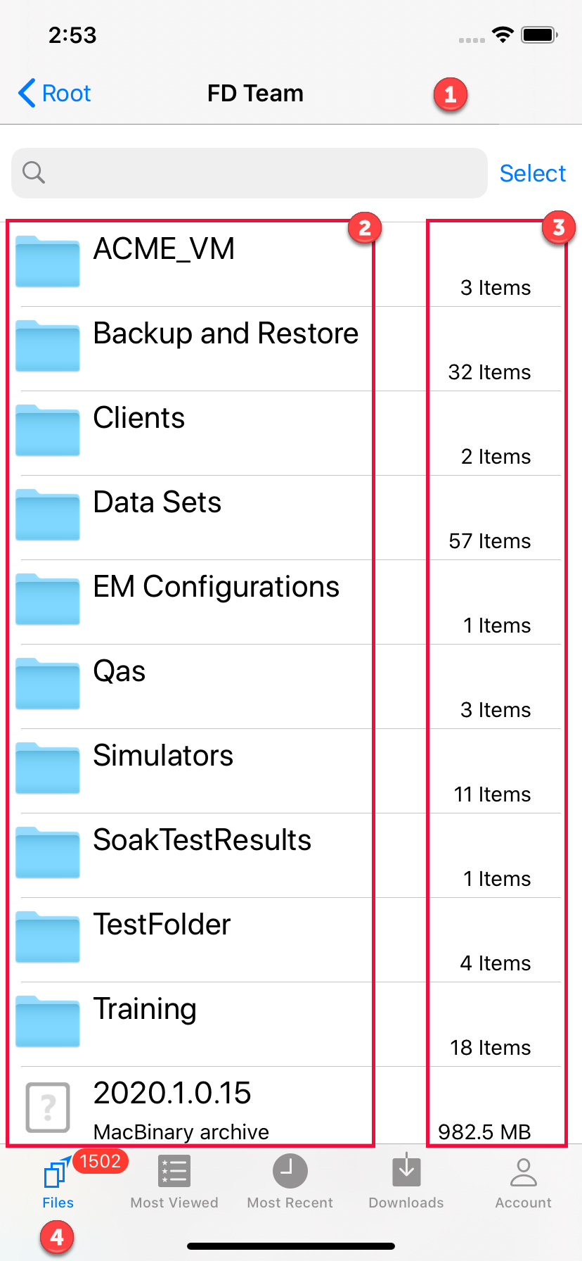 By default, after log in, the Files view lists the map points available to you from the connected server.