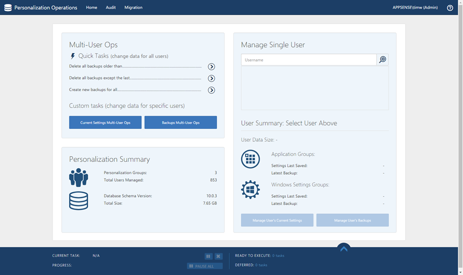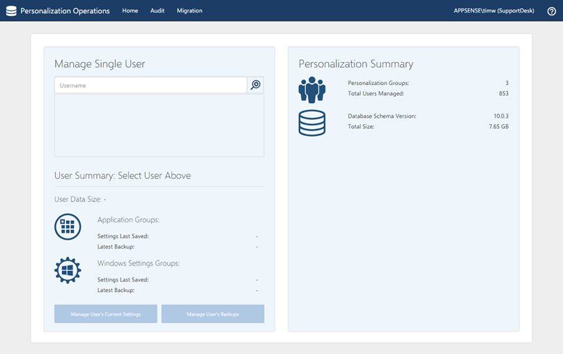 Depending on the user role assigned, users can manage backups and current settings for either single users or multiple users at a time. They can also search for and delete audit logs, and view the migration status of Personalization Groups.