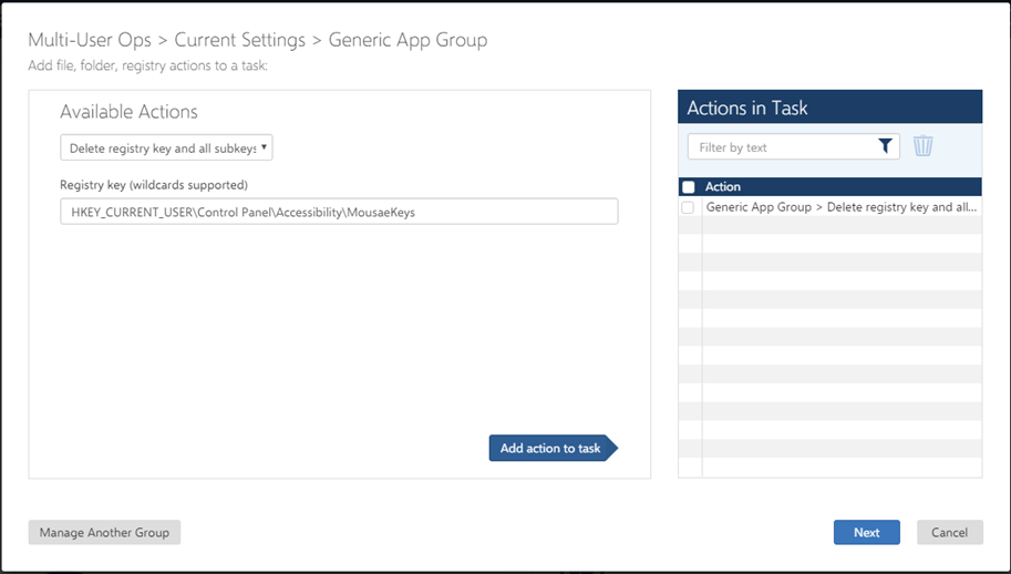 Create a custom task to delete a registry key and all its subkeys from the settings for a Windows Settings or Application Group. You can combine multiple file, folder, and registry actions in a single custom task.