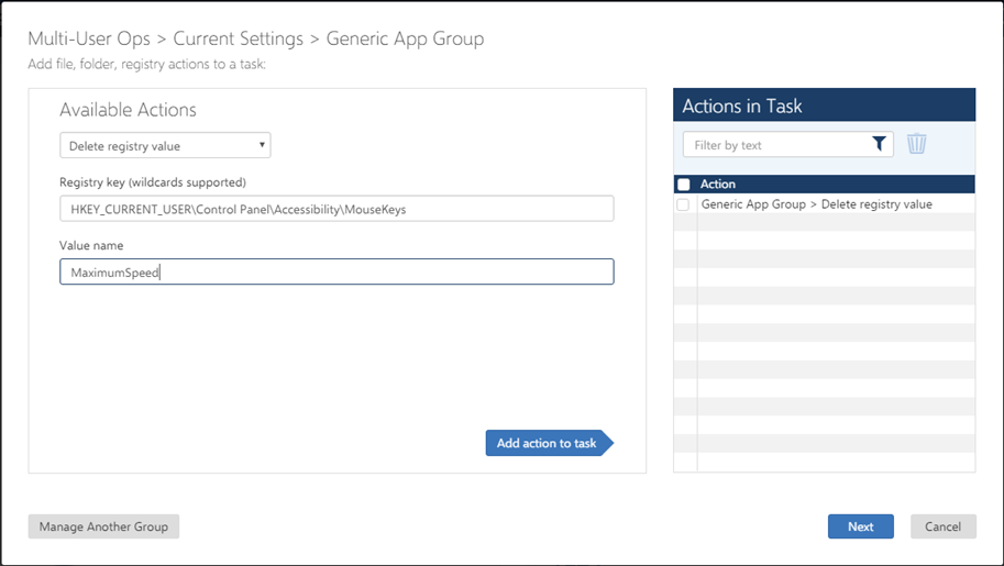 Create a custom task to delete a registry value from the settings for Windows Settings Groups or an Application Group. You can combine multiple file, folder, and registry actions in a single custom task.