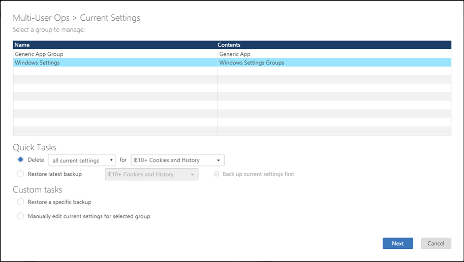 Perform a quick task to delete all current settings, registry items, or file and folder items for selected Windows Settings or Application Groups for multiple users.
